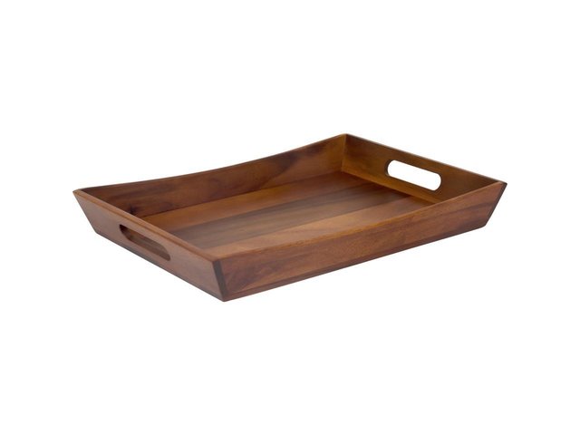 Bandeja de durable madera de acacia con un elegante diseño curvo. Dos cómodas manijas para levantarla.
